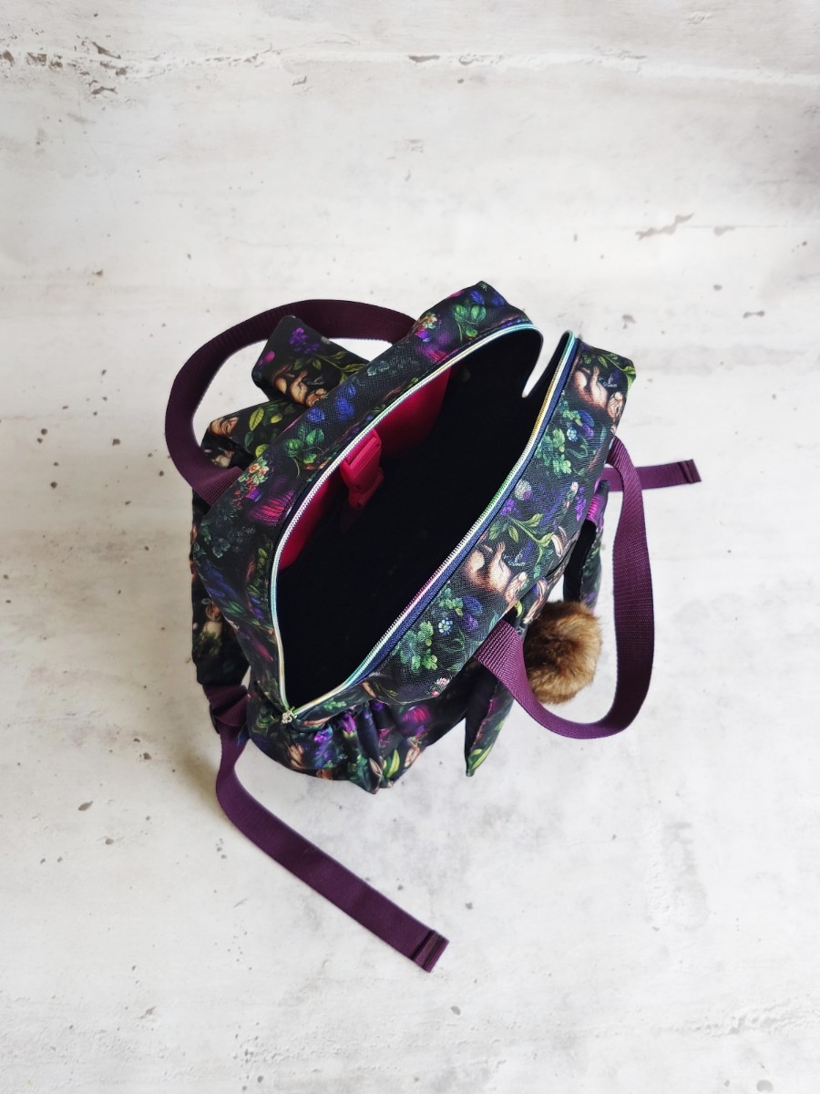 Plecak został uszyty z wodoodpornej tkaniny, co gwarantuje ochronę jego zawartości przed deszczem i wilgocią. Całość jest dodatkowo usztywniona wigofilem 150 i wyłożona gąbką, która znajduje się na plecach oraz naramkach, zapewniając dziecku maksymalny komfort noszenia.
