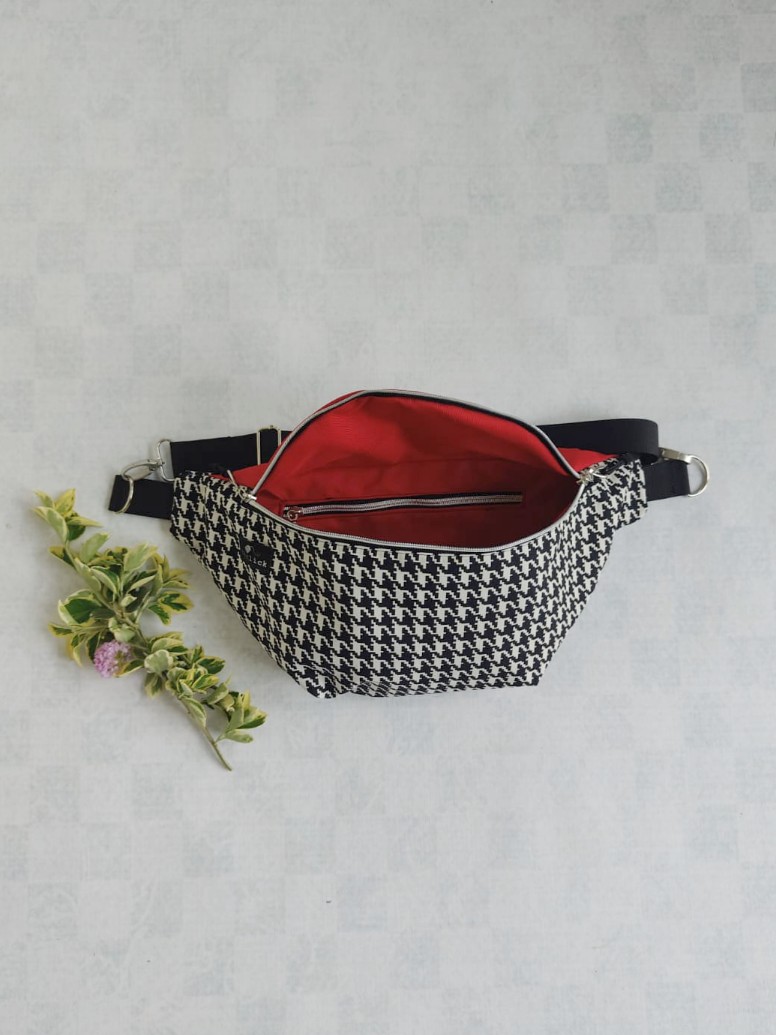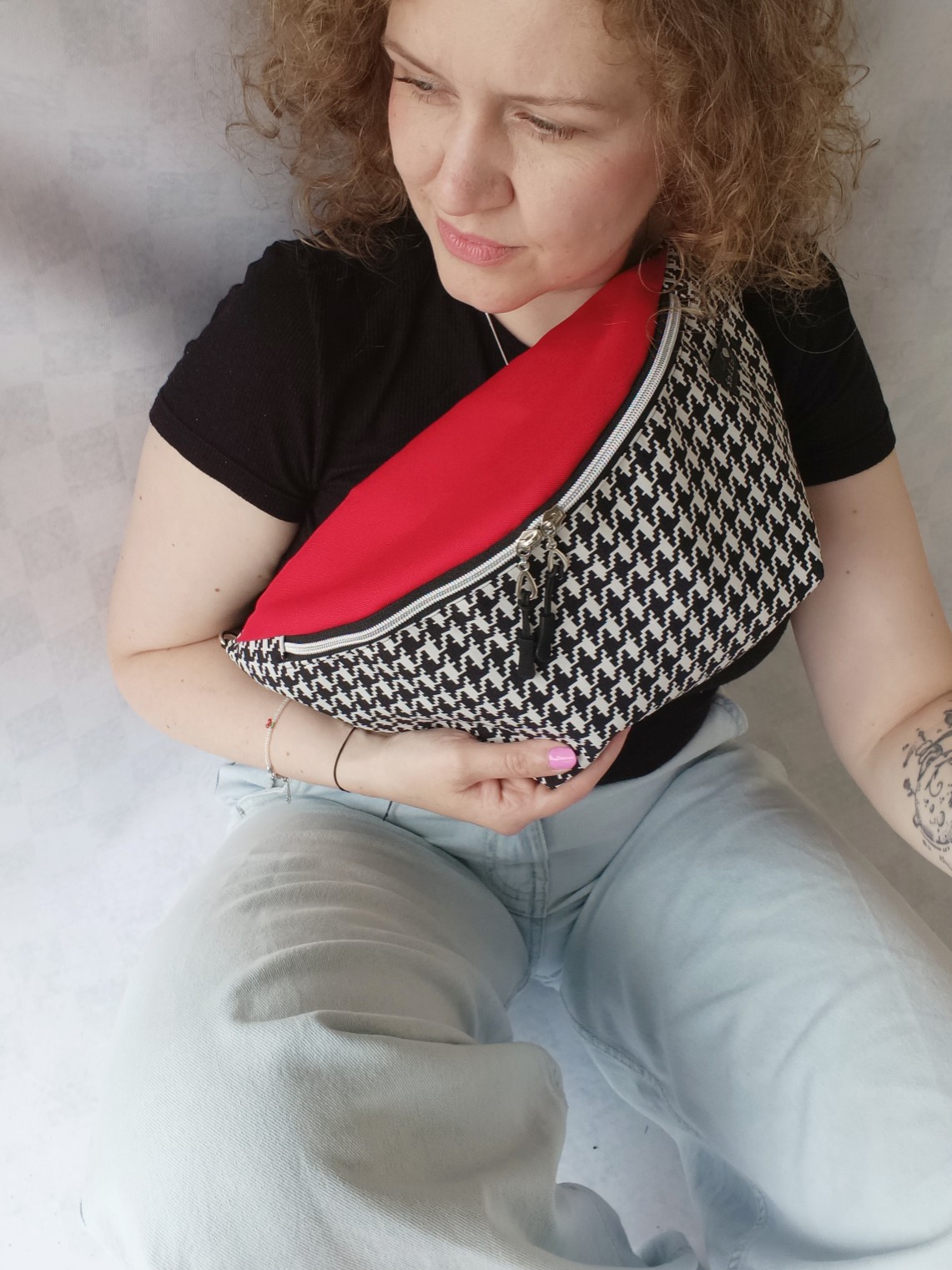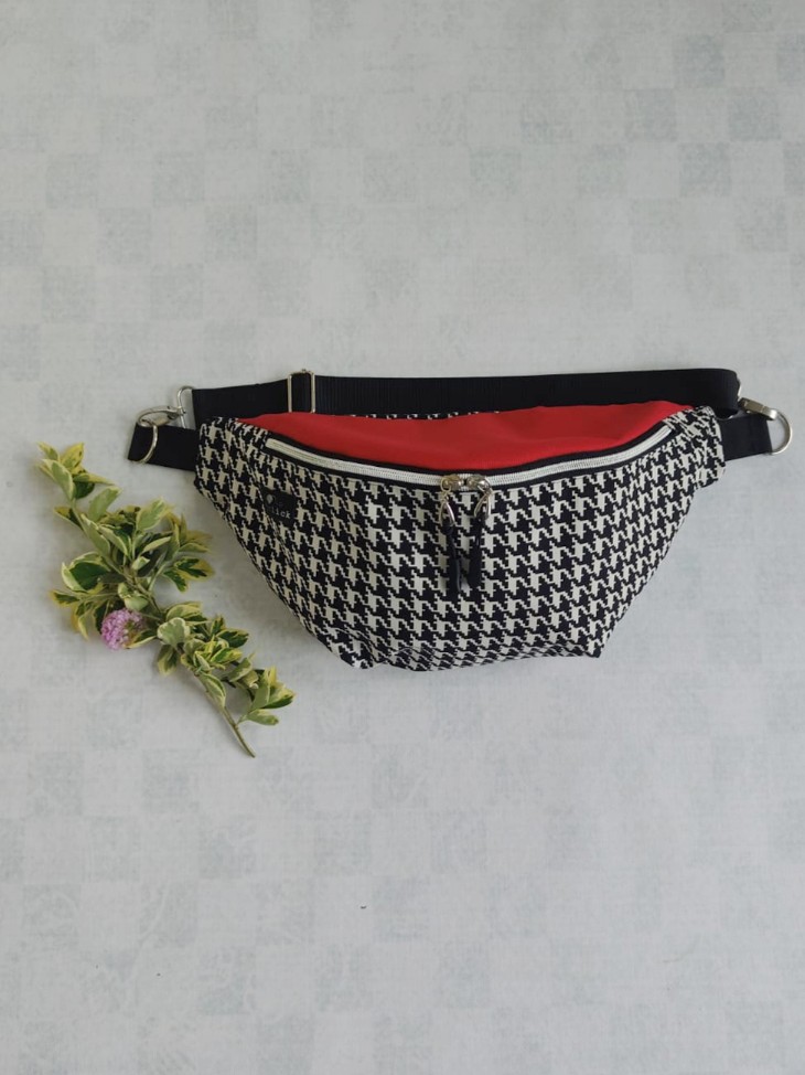 Nerka w rozmiarze XL uszyta z tkanin wodoodpornych Oxford ( pepitka i czerwona, gładka tkanina). Posiada kieszeń zamykaną na zamek w środku oraz dwie taśmy nośne ( krótszą i dłuższą).