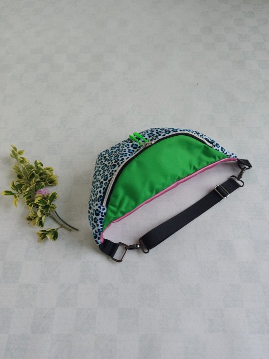 Nerka w rozmiarze XL do noszenia zarówno na biodrach, jak i na skos. W zestawie dwa paski ( krótszy na pas i dłuższy na skos). Kieszeń zamykana na zamek błyskawiczny w środku. Uszyta z tkaniny wodoodpornej Oxford oraz tył nerki z różowej eko skóry kaletniczej.