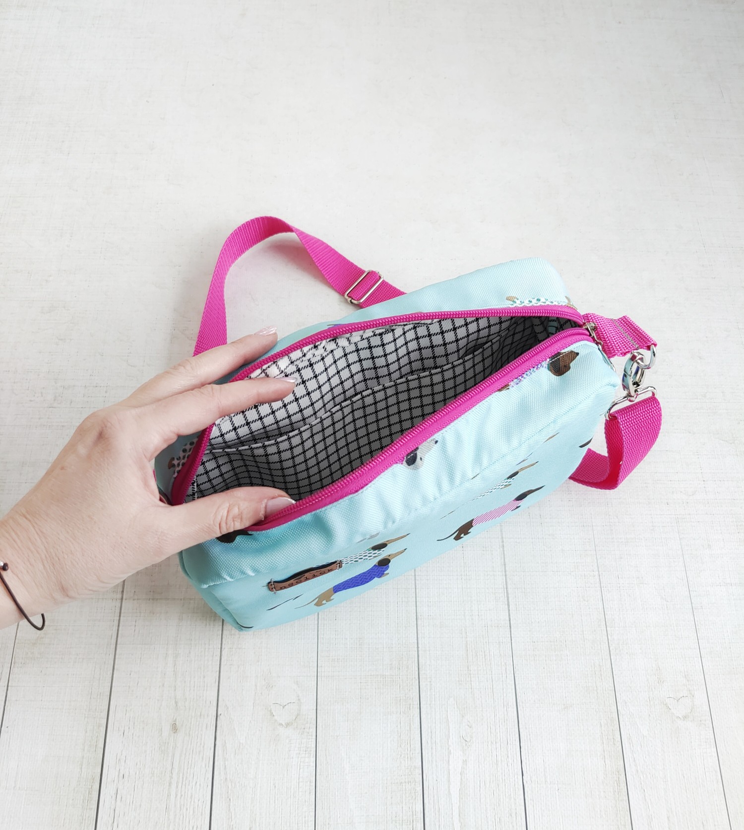 Pomimo niewielkich rozmiarów, torebka „Jamniki w natarciu” zachwyca funkcjonalnym układem kieszeni, który ułatwia organizację. Na zewnątrz, z tyłu torebki, znajduje się praktyczna kieszeń zamykana na zamek błyskawiczny, idealna na drobiazgi, do których potrzebujesz szybkiego dostępu – klucze, telefon czy karty. Wnętrze torebki skrywa dodatkową kieszeń, która ułatwia organizację, pozwalając na oddzielenie ważnych rzeczy, takich jak portfel czy dokumenty. Dzięki temu utrzymanie porządku wewnątrz torby staje się niezwykle proste, a Ty zawsze masz pewność, że wszystko znajduje się na swoim miejscu.